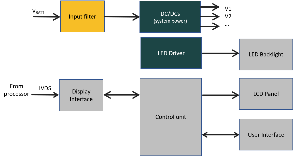 中心信息显示系统由控制单元、显示接口、LCD面板、LED背光源、LED驱动器和一些为整个系统提供电源的DC/DC组成。